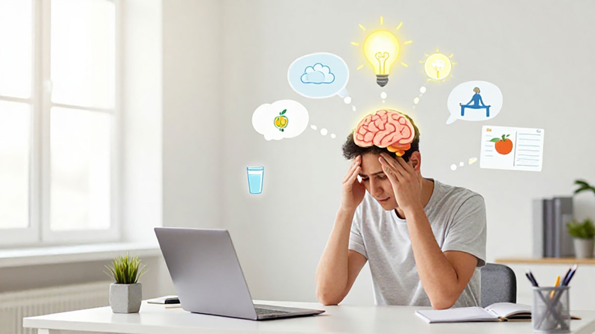 Stres kronis memengaruhi fokus dan memori. Teknik relaksasi seperti meditasi, pernapasan dalam, atau mendengarkan musik menenangkan bisa membantu menenangkan pikiran.